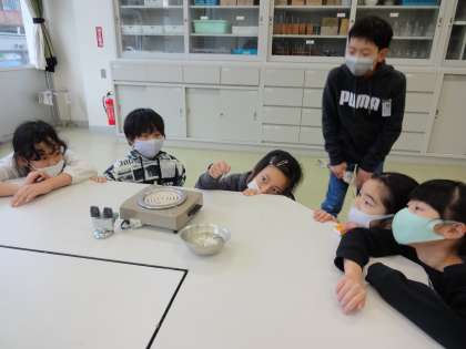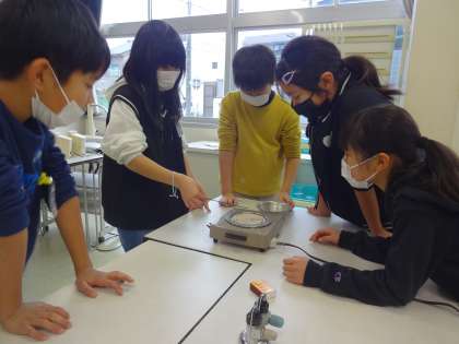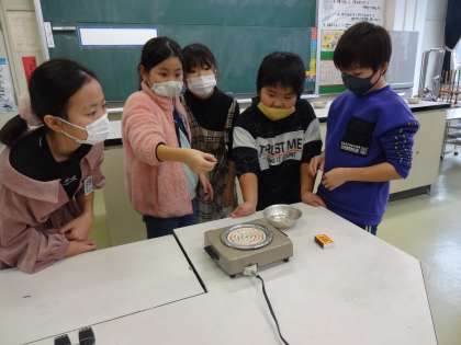 線香のけむりの様子から、電熱線によって温められた空気の動き方を観察しました。