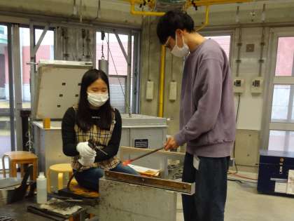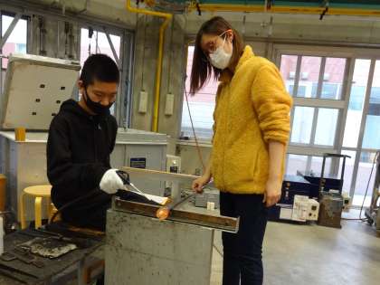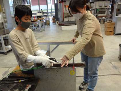 製作途中にガラスを冷ます工程が入ります。エアガンで強風を吹き付け冷まします。