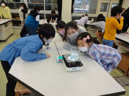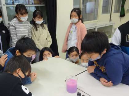 また、お湯の中に氷を入れて冷やすと、どのように水は動くのかも調べました。「し温インク」ピンク色のお湯がどのように変化するのか見逃さないようにと、釘付けになりました。