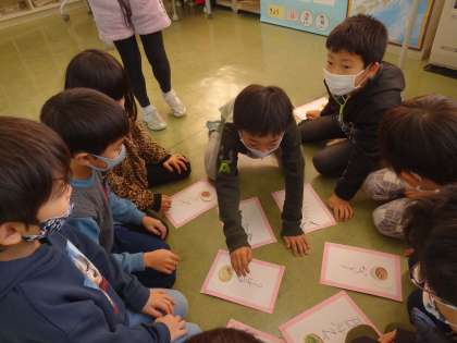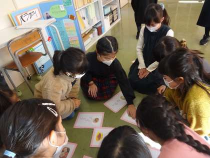 国際教室の子供が、「コウジカビの力をかりる」などと書かれた読み札を読んで、「かるた」をしました。