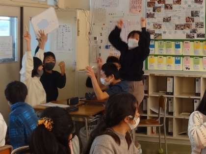 班で考えて、ホワイトボードに書いて提示します。正解すると歓声が上がります。