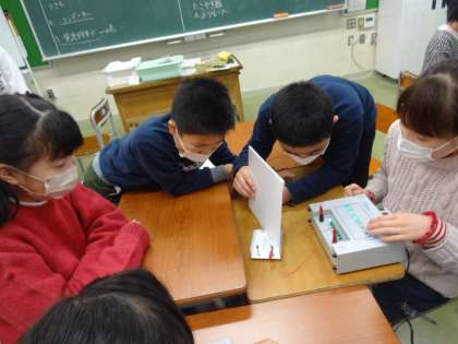 電源装置を使って、乾電池直列つなぎ3個分の電流を電熱線に流しました。