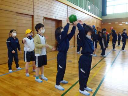 ボール送り、背中でボール運び等をしながら、色団対抗で競争しました。