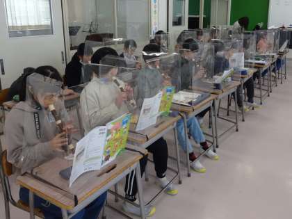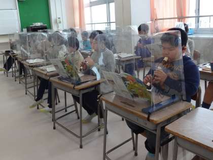 「オーラリー」をみんなで合奏できるように練習しています。交替しながら、1パートも2パートも演奏できるように技能を高めています。