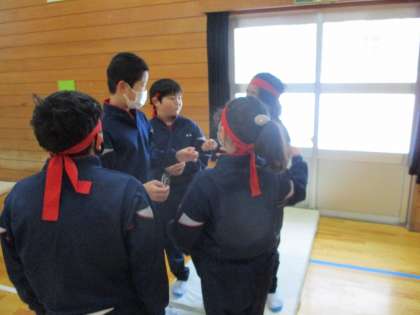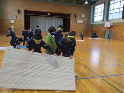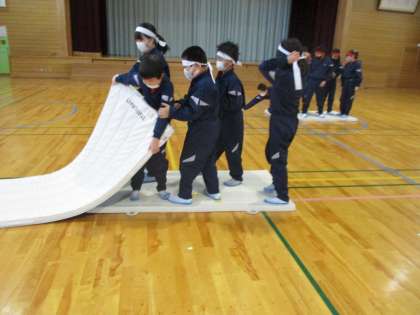 ルールは、チーム全員がマットから落ちないように、反対側の壁まで移動します。各団に分かれて作戦を考えて協力しながら取り組みました。白熱した戦いが繰り広げられ、体も心も体育館も熱くなりました。