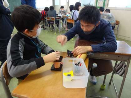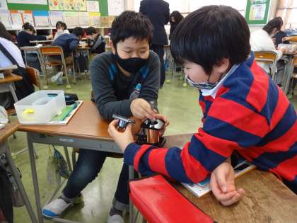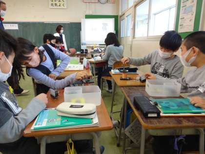 コイルの中に棒磁石を入れる・ぬくで電流が流れる、それにより逆向きに電流が流れることなどを、体験を通して学ぶことができました。
