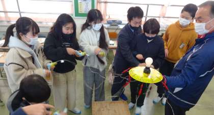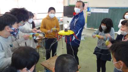 最後には、手回し発電機をいくつも使って、白熱球を光らせる実験も行いました。みんなで力を合わせて光らせたときには、歓声が上がりました。