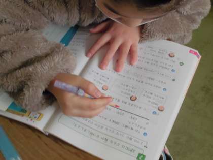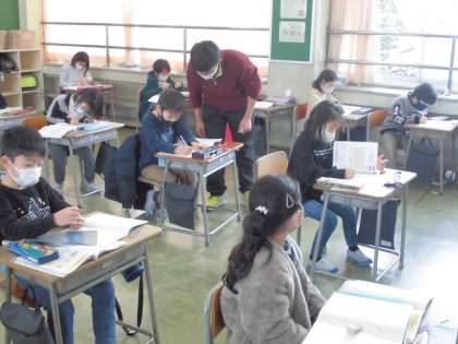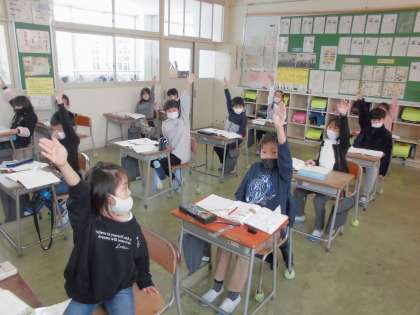 その後、いろいろな問題に取り組みました。「できた!」という声があちらこちらであがりました。発表したいという気持ちが挙手の姿勢にも表れています。