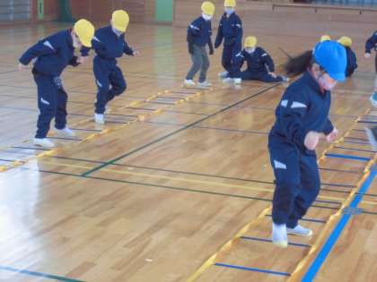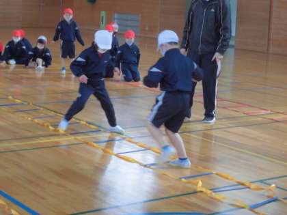 ラダートレーニングを行いました。ラテラルラン(サイドステップ)の時は、カニをイメージして、パラレルの時は、「中・中・横」と声を出して行いました。反対側からも行い、対面したところでじゃんけんをして勝ったほうが進むというゲームも行い、楽しく運動できました。