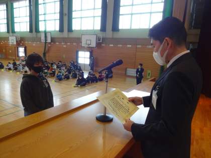 後半は、「手紙作文コンクールはがき作文部門4年生の部 佳作」を受賞した児童の受賞紹介をしました。おめでとうございます。