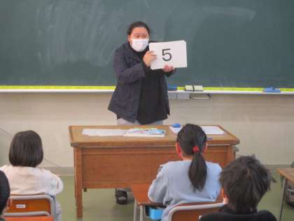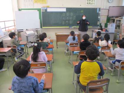 ALTのルエラ先生に「世界の国のあいさつジェスチャーゲーム」と「1から10の数の歌ゲーム」を教えて頂きました。