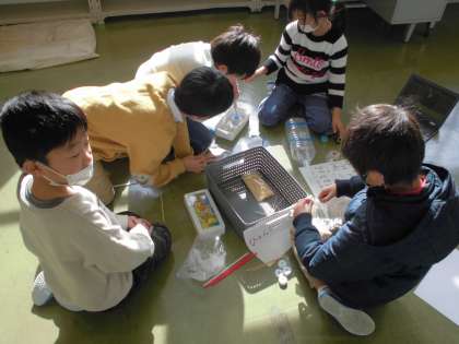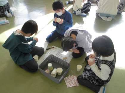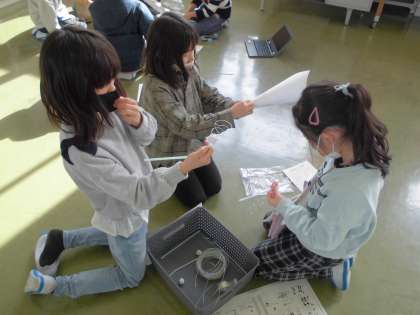 自分たちで設計図を作成して、おもちゃ作りをしています。「ぷかぷかボール」「ぴょんコップ」「ことこと車」等、楽しく遊べるおもちゃが出来上がりそうです。