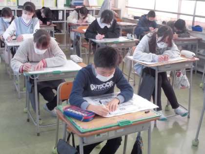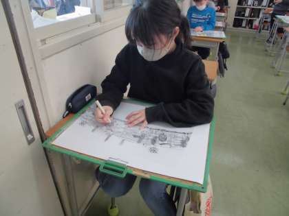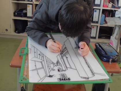 版画を製作しています。下絵の段階から力を入れてきたこともあり、全員が集中しています。彫る姿から緊張感も感じます。