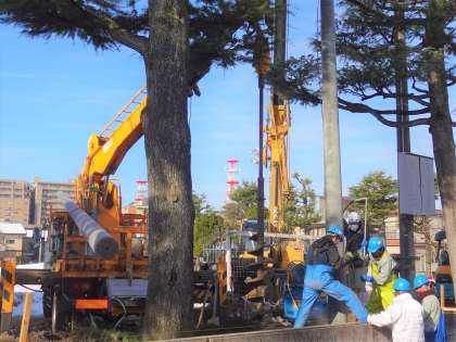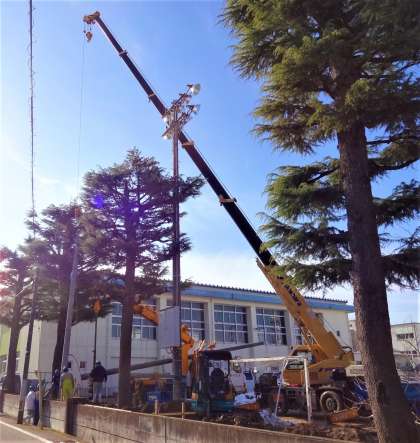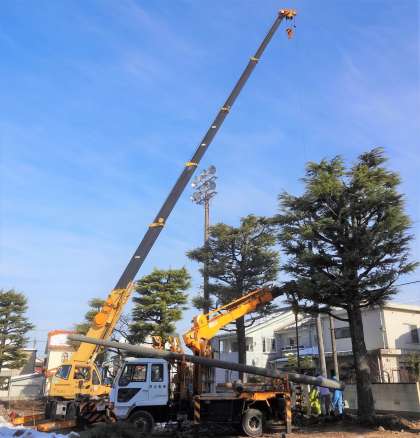今日から、新しい支柱をクレーンで吊って立て、ドリルで穴を空けて埋め込む作業に入りました。