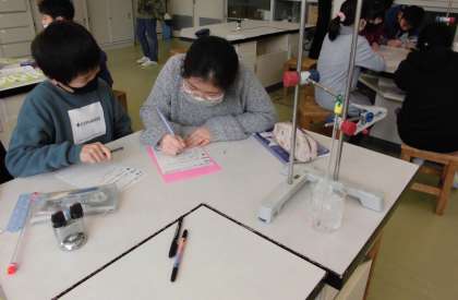 水を冷やしたときの温度の変わり方と水のようすを調べました。ガラス管に入れた水を、氷の入ったビーカーに入れます。氷に塩水を注いで、試験管の中の水の温度変化とようすを調べます。温度が下がってもなかなか凍らず、まだかまだかとようすを見守りました。氷ができ始めたときには、歓声が上がりました。