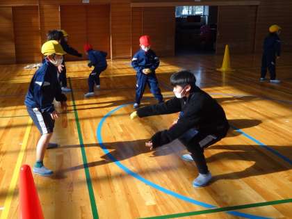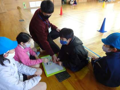 お手玉運び競争に勝つために、どのように動けばよいかを考えて、ゲームに生かしています。