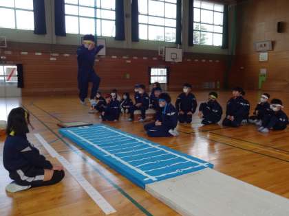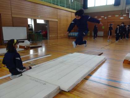 走り幅跳びの練習に励んでいます。助走から踏切までの5歩のリズムをつかんだら、体を上へ引き上げて、より遠くへ跳ぶためのフォームを身に付けようとしています。