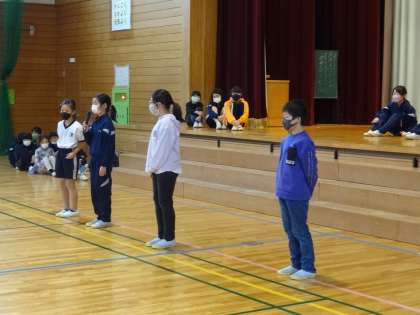 さわやか集会で、4年生の子供たちが、「長縄跳びの組合せ技」の発表をしました。体育科の授業で練習してきた技の披露です。