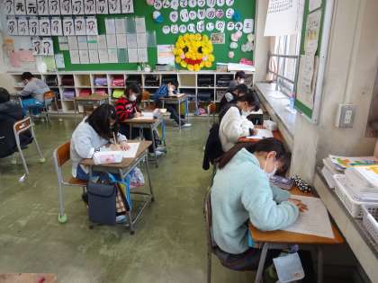 漢字チャレンジテストの2回目を静かに行っています。1回目に合格できなかった子供は、80点以上を目指します。合格できた子供は、今回、100点満点を目指します。