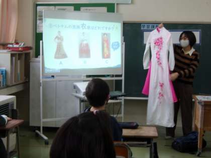 ベトナム出身の富山国際交流員の方に、ベトナムの文化や生活についてお話をしていただきました。動画や写真、ベトナムの服(アオザイ)を見せながら、ベトナムについて詳しく説明してくださいました。