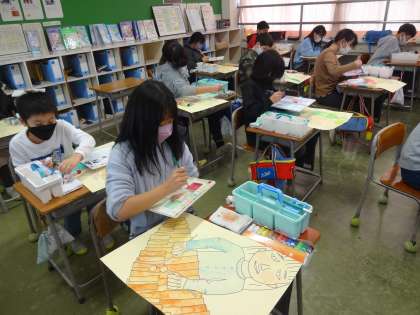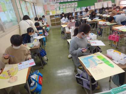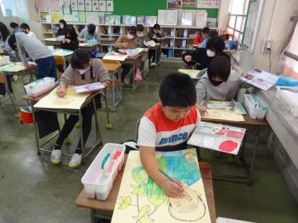 忘れられない思い出の気持ちを表現できるように描いています。構図がよく、水をたくさん含ませた筆で描く色づかいもよく、教室全体のレベルの高さを感じます。水彩で塗る技能の上達を感じながら、集中して取り組んでいます。