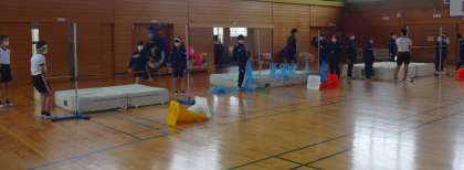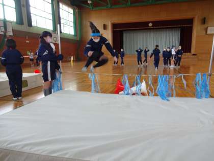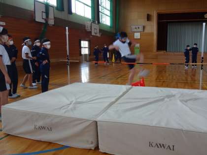 ゴムひもコーナーを含め、3か所の練習の場から選んで取り組んでいます。バーやマットを直したりスタートの合図をしたりと、協力しながら自分たちの力で授業を進めています。