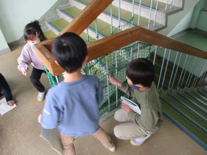 大きい数の学習のまとめで「数探しビンゴ」を行いました。一人一人が校舎の中を探検する中で、花びらの数を数えたり、階段手すりの下にある棒の数を数えたりしました。ビンゴを楽しむことを通して、大きな数を何度も数えました。