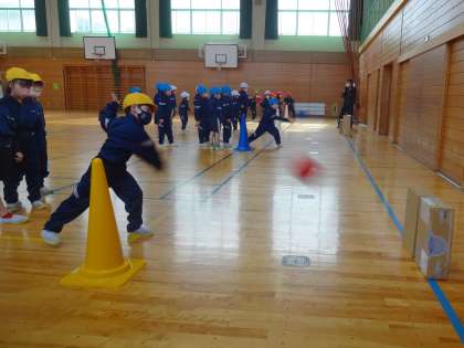 段ボール箱や的のボードに目がけて、ボールを投げる練習をしました。