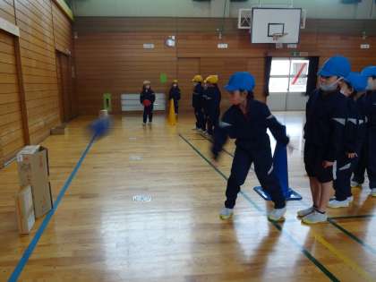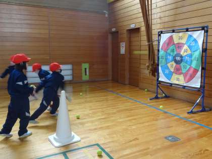 的当て気分で取り組み、正確に投げる、強く投げるなどの技能を高めていきます。