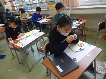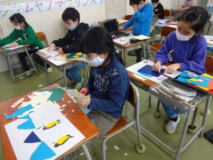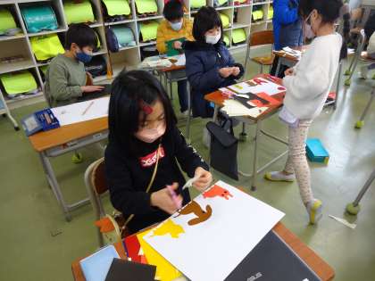 下書きが終わり、いよいよ版作りです。色の付いた紙をイメージする形に切り、切り絵のように貼り合わせていきました。夢中になって取り組みました。