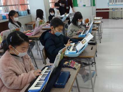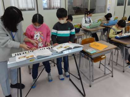 「小ぎつね」の曲を鍵盤ハーモニカで弾く練習をしています。難しいのは、指のポジションが、「ド」と「ファ」の2つあるところです。ポジションの移動に気を付けながら、演奏しないで指の動かし方を学んでいます。