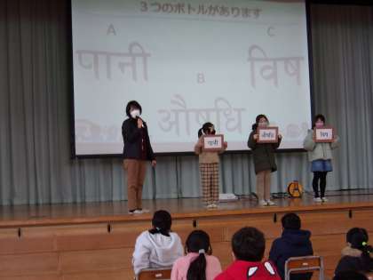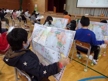 まず、国の名前を書いたカードを、自分で見えないように持ち、友達にヒントをもらって当てたり、その国を地図で探したりしました。そして、開発途上国についての話を聞き、世界の国々について理解を深めました。