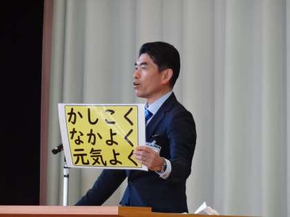 校長先生は、やなぎっ子の目当て「かしこく」「なかよく」「元気よく」について、話されました。