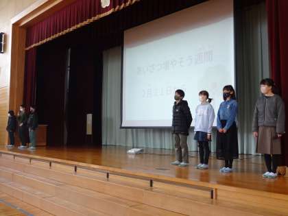 さわやか集会では、運営委員の子供たちが、来週から始める「あいさつ増やそう週間」について、説明・呼びかけをしました。