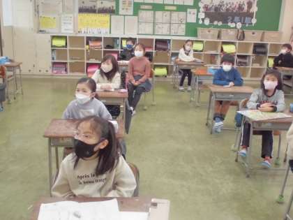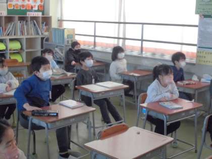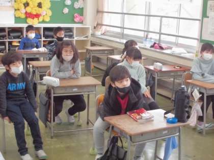 本来は、昼休みに視聴覚室で行う予定でしたが、参加者が多く密になると思われたので、図書委員が事前に録画したものを教室で流しました。おかげで、全校児童が見ることができました。