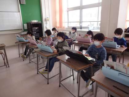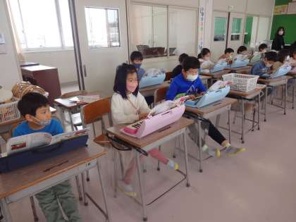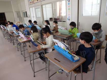 鍵盤ハーモニカでは、歌詞の音符どおりではなく、「ミーー ミーー ファ ファ ファ ミー」というふうに弾きます。ホースを口にくわえず、指使いを覚える練習に取り組んでいます。
