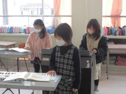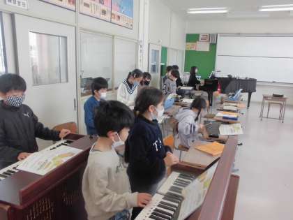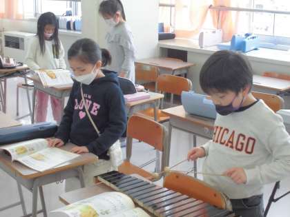3人1組になり、歌、キーボード・オルガン、木琴の担当を決めて、「こぐまの2月」を演奏しました。リズムをはだんだん速くしても上手に演奏することができました。