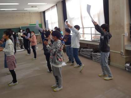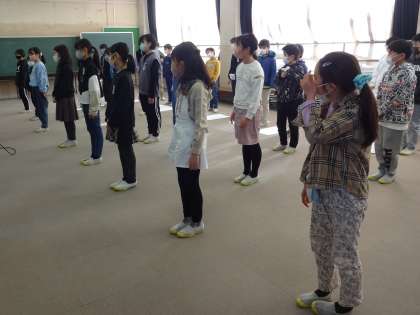 4年生は、卒業を祝う会で発表する出し物の練習を続けてきました。今日は、学年全体で通し練習をしました。