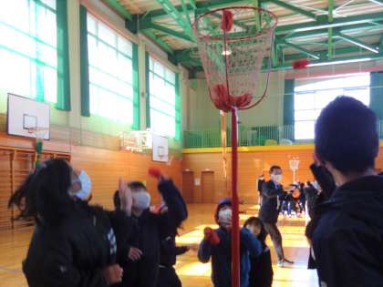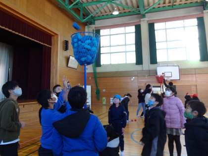 サンサンタイム(業間休憩)に、6年生と玉入れをして交流しました。
