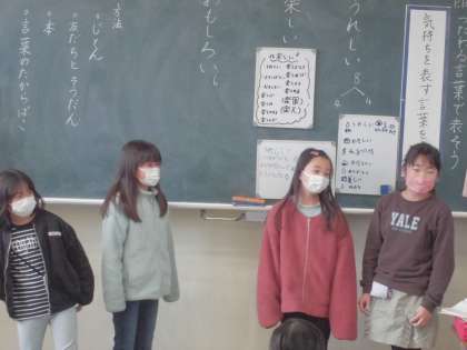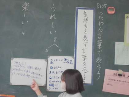 「うれしい」「楽しい」という言葉から、どんなことが思い浮かぶのか考えて、グループごとに発表しました。いろいろな言葉が出て考えが広がっていきました。
