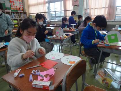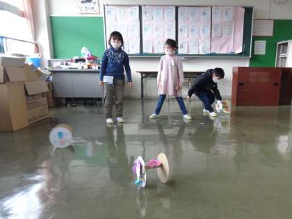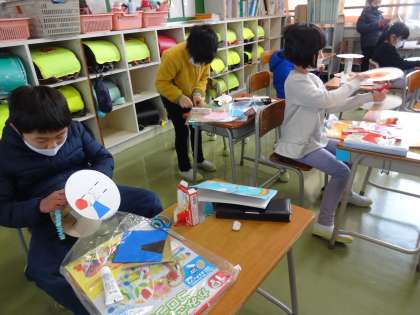 転がり方や、付けた飾りがどのように動くのかどのように見えるのかなどを知るために試すと、また工作です。自分のイメージを大切にしながら、よりよい作品にしていきます。