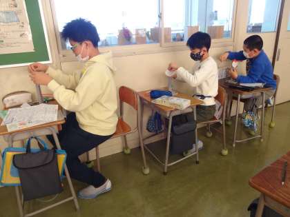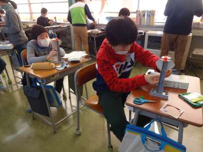 「ふりこのきまり」の学習がスタート。実験キットを組み立てて、まずは「ふりこ」に触れました。「ふりこ」の動き方をよく観察し、分かったことや疑問に思ったことを見付けました。