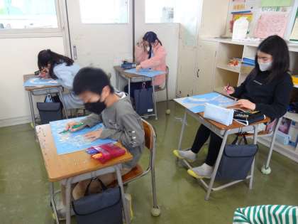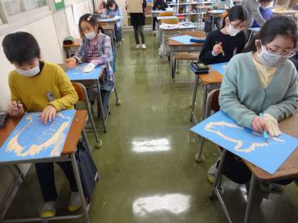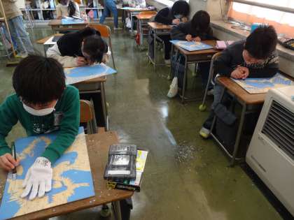 けがに気を付けながら、細かい線を地道に彫っています。題材は「動物の○○の瞬間」です。丁寧に彫っているので、仕上がりまでに時間がかかりそうです。
