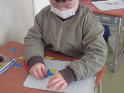 4枚の色板を使って、指定された形を作りました。子供たちは、試行錯誤しながら取り組み、完成すると、「できた」「さっきよりも簡単だよ」という声を発しました。