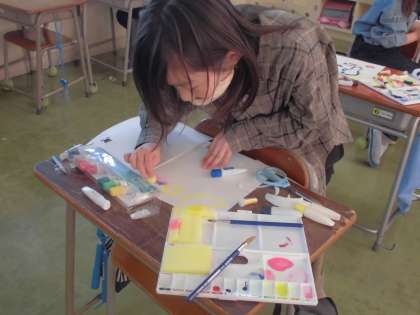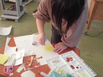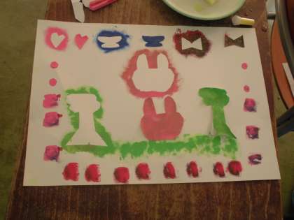 絵の具を使って、いろいろな形をうつしました。手を絵の具で汚している子供もいましたが、気にしないで一生懸命取り組んでいました。