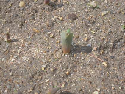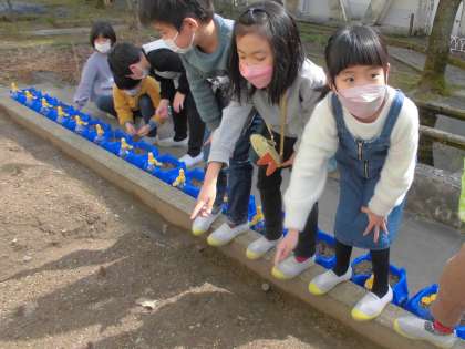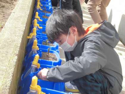 学年の畑や自分の鉢のチューリップの球根を観察しました。芽が出てきているものが多く、「すごい、見て」「何色のチューリップが咲くのかな」「こっちの芽は大きいよ」などの声が上がりました。