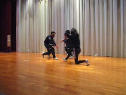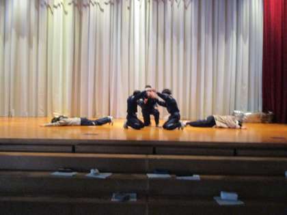 各団でテーマを決めて、団ごとに表現していきました。赤団は「川で釣り」、白団は「火山」、青団は「もぐらたたき」、黄団は「波に立ち向かう魚たち」です。効果音を流しながら臨場感あふれる表現ができました。