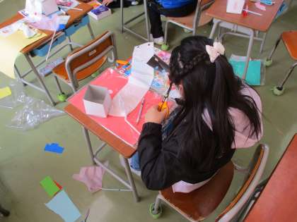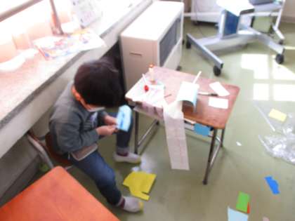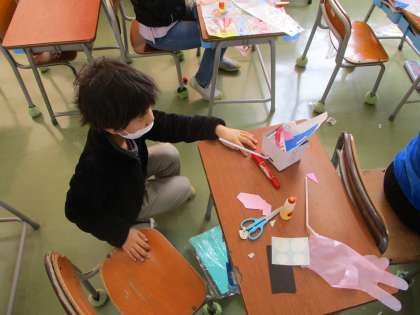 にょきにょき飛び出す袋の飾り付けをしています。自分の思い浮かべているものを作ろうとはさみで上手に切り出したり、油性ペンで書いたりしています。