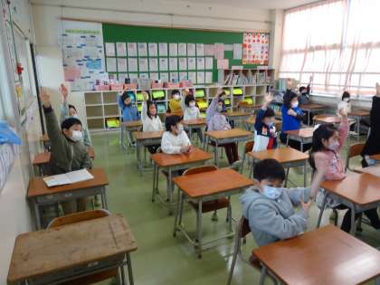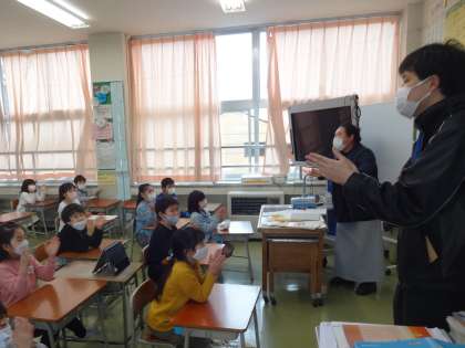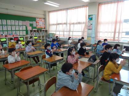 数字の英語の言い方を教わった後、歌を歌いながら覚えました。さらに、歌いながら決められた数字を発声したときには、拍手をする遊びをしました。