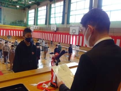6年生の修了式を行いました。学年を代表して1名の子供に、校長先生から修了証が授与されました。